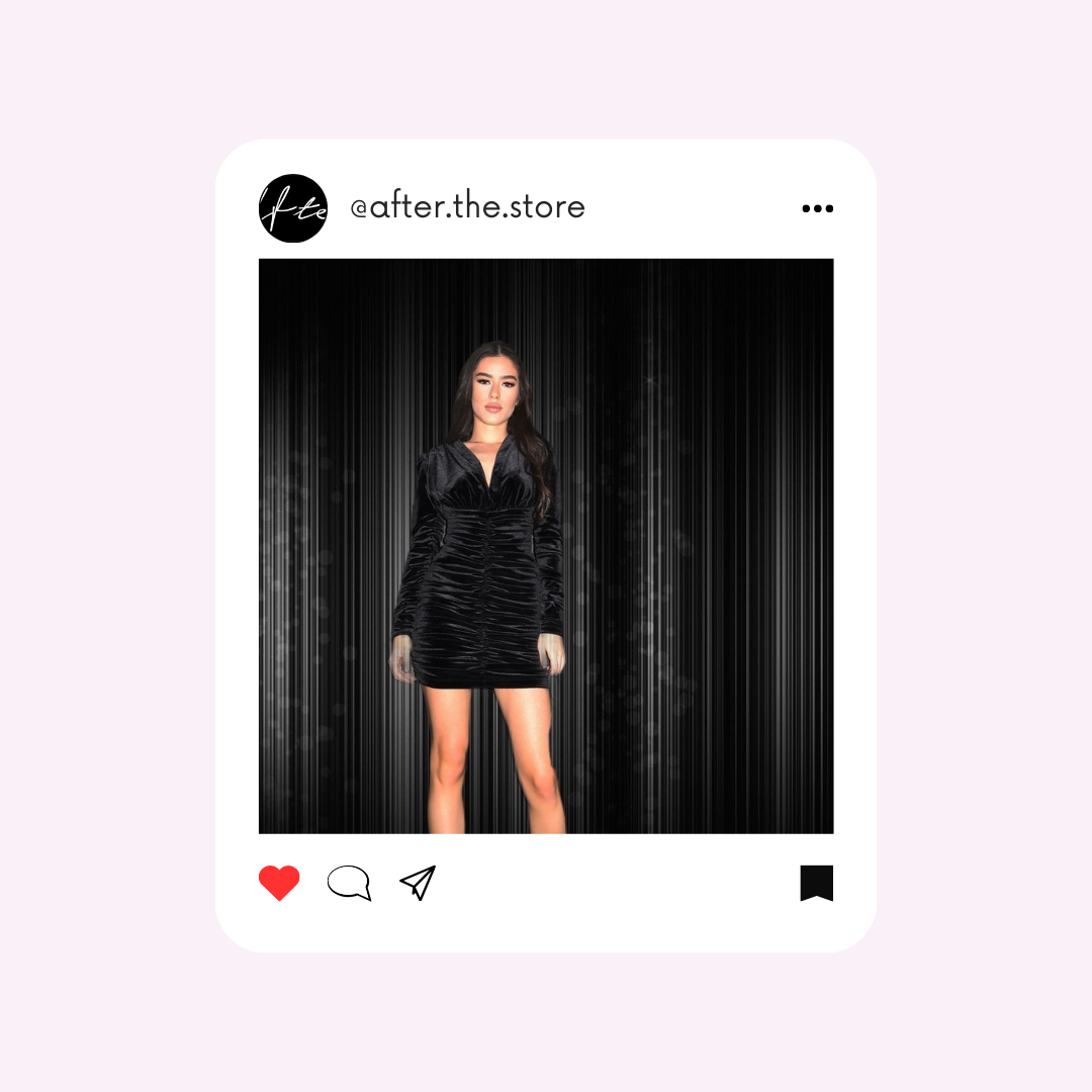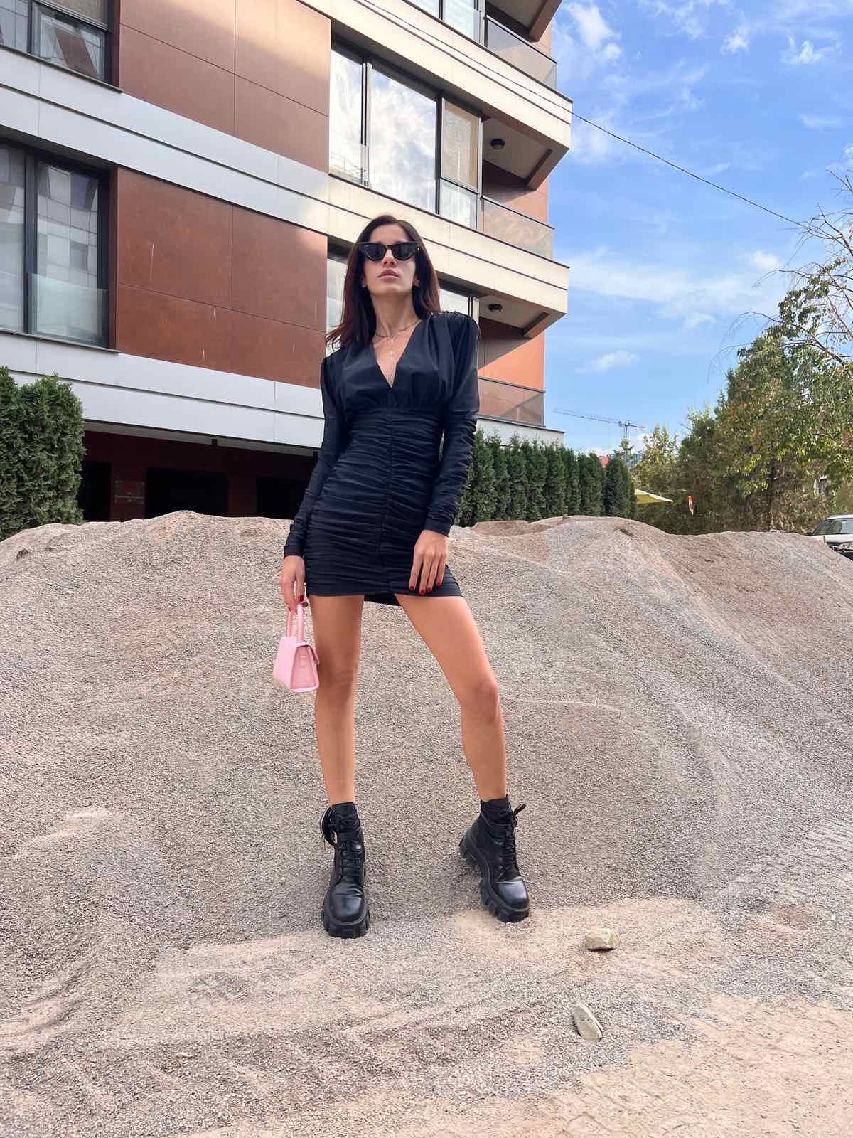 Рокля с мини дължина, остро деколте, дълъг ръкав.